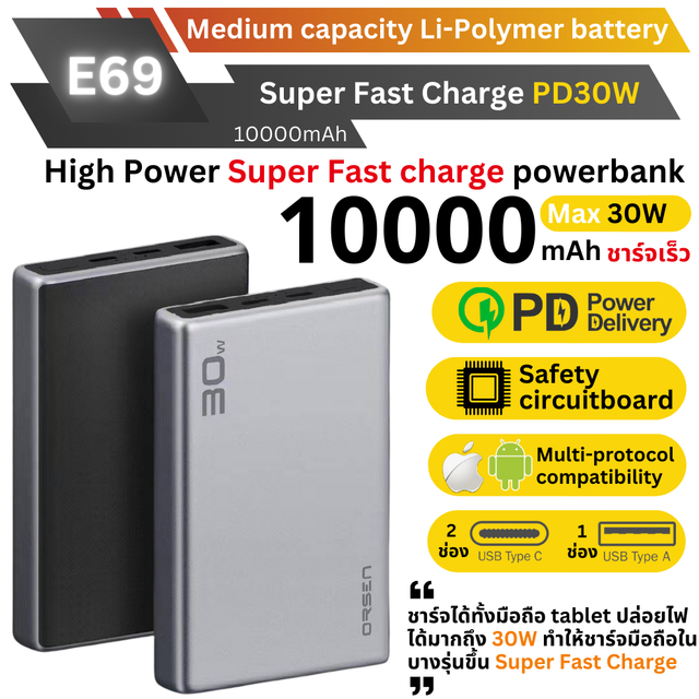 Powerbank รุ่น E69 มีระบบชาร์จเร็ว มาพร้อมมาตรฐานการชาร์จใหม่ ซึ่งรองรับการชาร์จเร็วจากหลายค่ายมือถือเกือบทุกยี่ห้อ จ่ายไฟสูงสุด 30W รองรับการชาร์จเร็วได้หลากหลายอุปกรณ์ที่มีอยู่บนท้องตลาด มาพร้อมกับเทคโนโลยี PD (Power Delivery) มี 3 Ports ช่อง USB-A 1 ช่อง และช่อง Type-C 2 ช่อง เป็นทั้ง input & output สามารถใช้ชาร์จโทรศัพท์มือถือ แท็บเล็ต ที่มีช่อง Type-C ดีไซด์สวย ผ่านมาตราฐานอุตสาหกรรม ปลอดภัย ทนทาน มีระบบตัดไฟอัติโนมัติ หากเกิดไฟเกินกระชาก E69 มีความโดดเด่นที่ 1) ขนาดของตัวสินค้ามีขนาดที่เล็กกะทัดรัด และสามารถพกพาได้ง่าย 2) ดีไซน์ผิวเคลือบนาโนสเปรย์ ผสมความเป็นเมทัลลิค ป้องกันการลื่นไหลและจับได้ถนัดมือ 3) มี ports ที่เป็น Type-C 2 ช่อง จ่ายไฟเข้า-ออก สูงสุดที่ 30W ผลิตภัณฑ์ของแท้ จากแบร์น Eloop ผู้ผลิตแบตสำรองที่นิยมที่สุดในประเทศไทย และพิเศษอย่างที่เคย สินค้าจัดส่งฟรี!