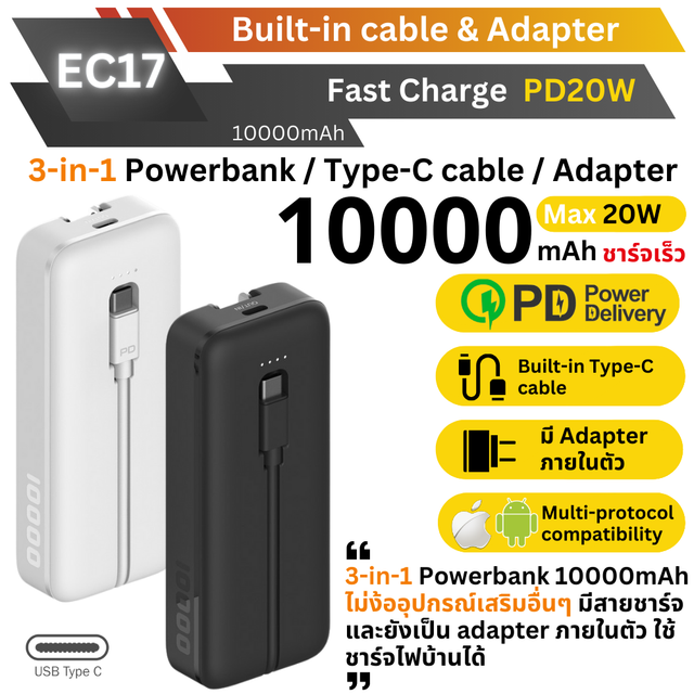 EC17 Powerbank 10000mAh เป็นหัวชาร์จ และมีสายในตัว Fast Charge PD 20W