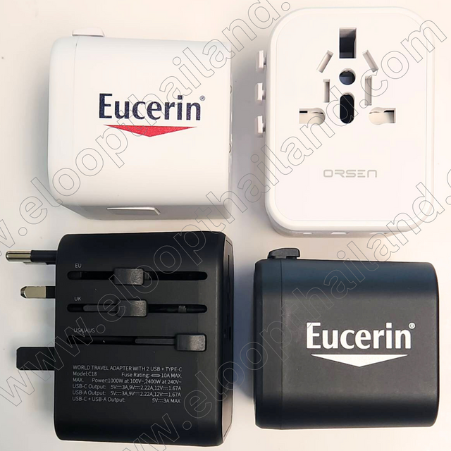 Travel Adapter อะแดปเตอร์ หัวชาร์จที่ใช้ได้กับทุกรูเสียบปลั๊ก ใช้ได้ทั่วโลกรวมถึงใช้ในประเทศไทย เพราะมีช่องจ่ายไฟเร็ว 20W เหมาะสำหรับทำเป็นของพรีเมี่ยมแจกให้แก่กลุ่มที่มีแนวโน้มจะไปต่างประเทศ จึงเป็นสินค้ายอดนิยมแก่บริษัททัวร์ travel agency สายการบิน หรือบริษัทต่างประเทศ เนื้อที่ในการสกรีนจะเป็นด้านบน ซึ่งในเวลาใช้งานก็จะเห็นโลโก้ของลูกค้าได้ชัดเจน