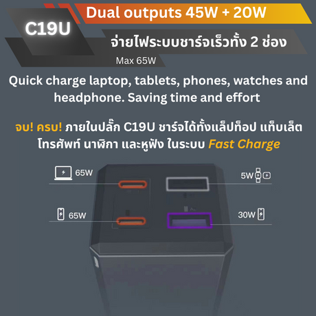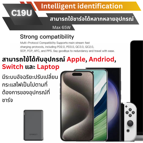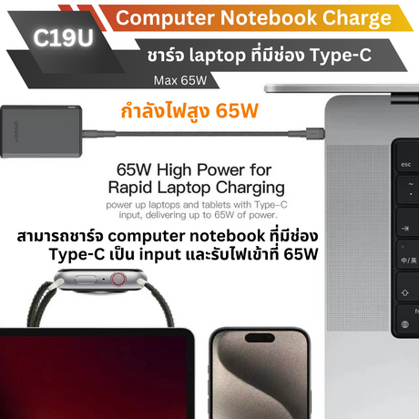 ได้ครับ อะแดปเตอร์ของ Eloop & Orsen มีชิปอัจฉริยะ (intelligent chip set) ที่สามารถปรับกำลังในการจ่ายไฟให้พอเหมาะกับความต้องการของอุปกรณ์นั้นๆ ไฟไม่ล้น และรักษาความร้อนได้ดี ไม่ว่าจะเป็นโทรศัพท์มือถือ แท็บเล็ต Laptop/Notebook หรือหูฟัง Bluetooth & Smart watch อย่าง iWatch ยกตัวอย่างเช่น Adapter รุ่น C19U 65W มีกำลังไฟมากพอที่ใช้ชาร์จ computer notebook ได้ และในเวลาเดียวกันก็สามารถชาร์จโทรศัพท์มือถือที่ต้องการกำลังไฟที่ 25W ได้เช่นกัน และยังมีมีช่องแรงไฟตํ่าสำหรับชาร์จนาฬิกาอัจฉริยะ iWatch หรือ หูฟัง Bluetooth ได้ ซึ่งทำให้ปลอยภัยยิ่งขึ้น และอะแดปเตอร์รุ่นนี้ยังมาพร้อมกับ GaN technology รุ่นใหม่สุด ช่วยลดความร้อนในเวลาชาร์จ